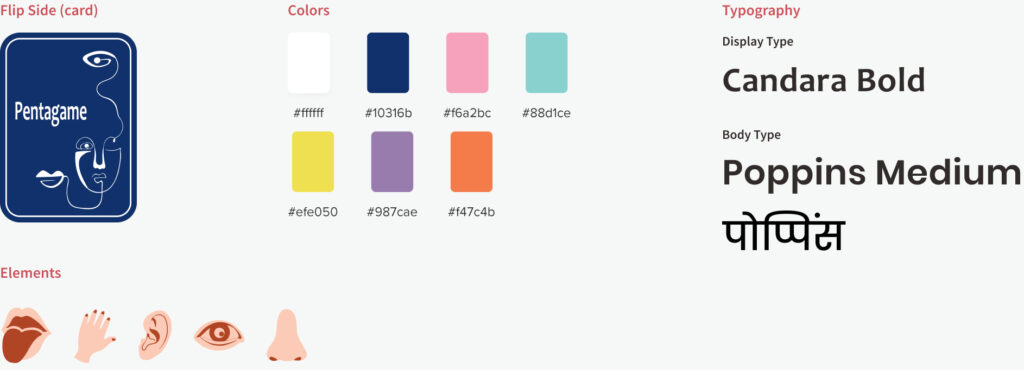 The cards are thoughtfully designed to meet the needs of the focus group. There are five senses, each distinguished by a different color to facilitate easy differentiation. In addition, the communication medium is bilingual, featuring both Hindi and English to satisfy the vernacular language preference of the audience.