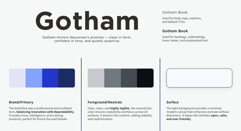 The visual identity is rooted in clarity and confidence, brought to life through a deep, trustworthy blue and the clean precision of Gotham type. The color and typography together evoke a sense of professionalism and dependability while maintaining a modern, forward-thinking edge.