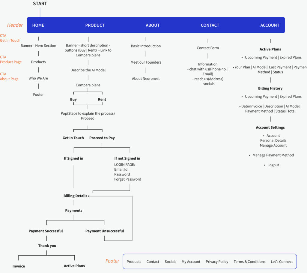 We explored two sitemap approaches—one with individual AI Solutions directly in the main navigation, and another with a centralized AI Solutions listing page. We chose the latter for its scalability, allowing for easier expansion as more solutions are added in the future.